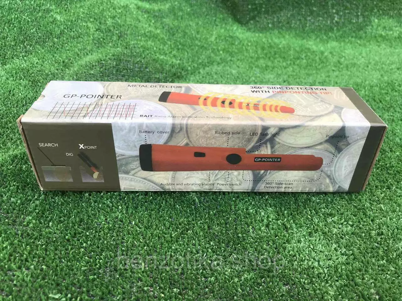 1) Точечный металлоискатель пинпоинтер GP Pointer имеет цельный, выполненный из прочного пластика корпус, в передней части которого находиться само устройство обнаружения, а в задней отсек для батареи.