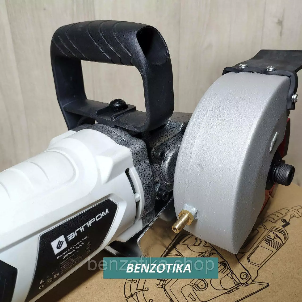 Для повышения точности реза установлены ролики, направляющие и боковые захваты. Конструкцией предусмотрено две рукоятки: задняя рукоятка, на которой расположена клавиша пуска и передняя дугообразная рукоятка, для более удобного захвата и контроля над инструментом. Обе рукоятки имеют резиновые накладки, предотвращающие проскальзывание. Данный инструмент имеет пять алмазных дисков, диаметром 125 мм, которые в рабочем режиме охлаждаются водой, поступающей из шланга и подающейся на полотно внутри защитного кожуха. Отрегулировать ширину прореза в изделии можно с помощью изменения количества распорных колец.