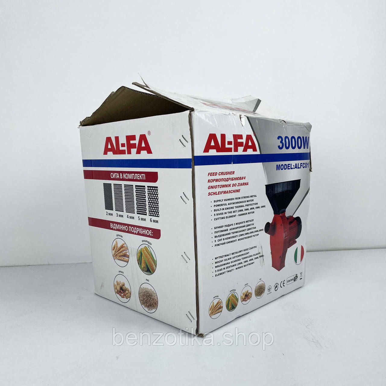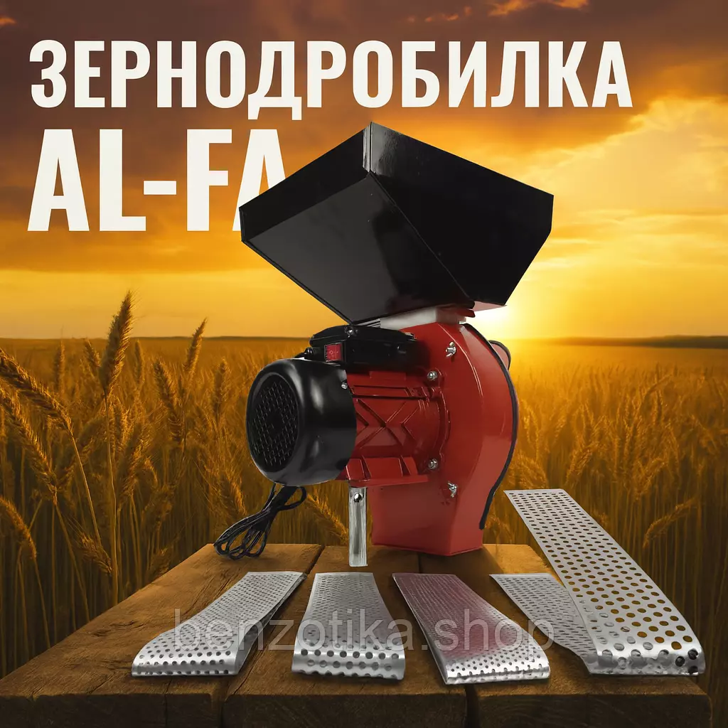 Зернодробилка AL-FA ALFC01 3 кВт, 300 кг/ч, 5 сит в комплекте