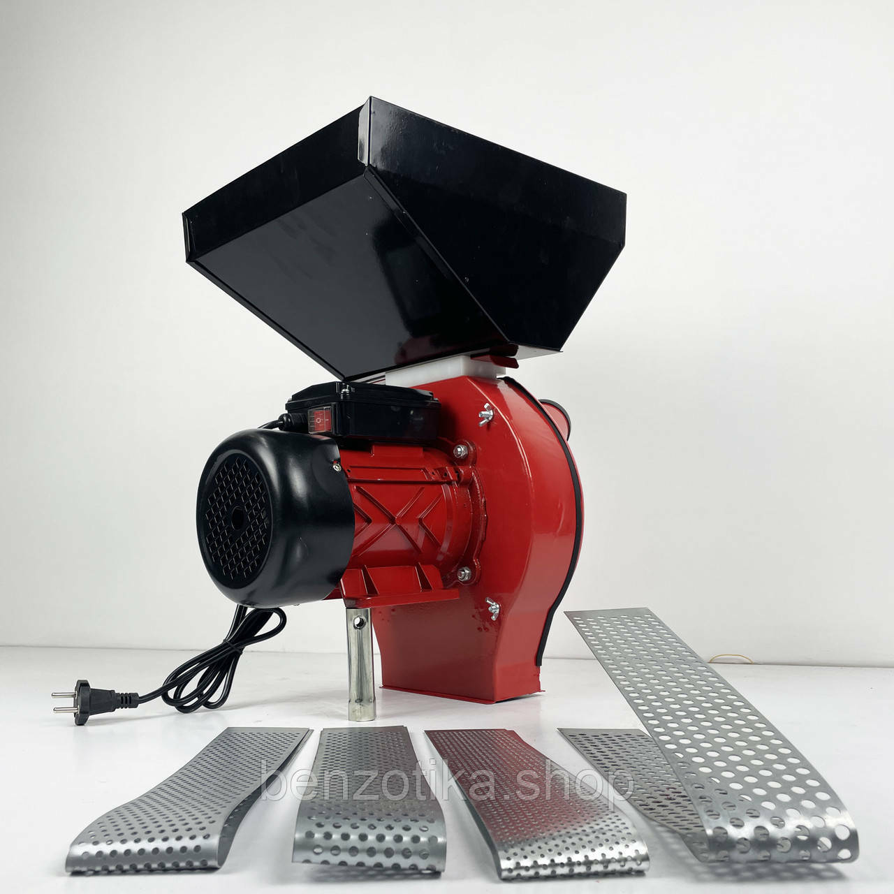 Модель оснащена однофазным электродвигателем с пусковым конденсатором, что обеспечивает стабильный запуск и долгий срок службы. В комплект входят 5 сит (2, 3, 4, 5, 6 мм) для регулировки степени помола под разные задачи.